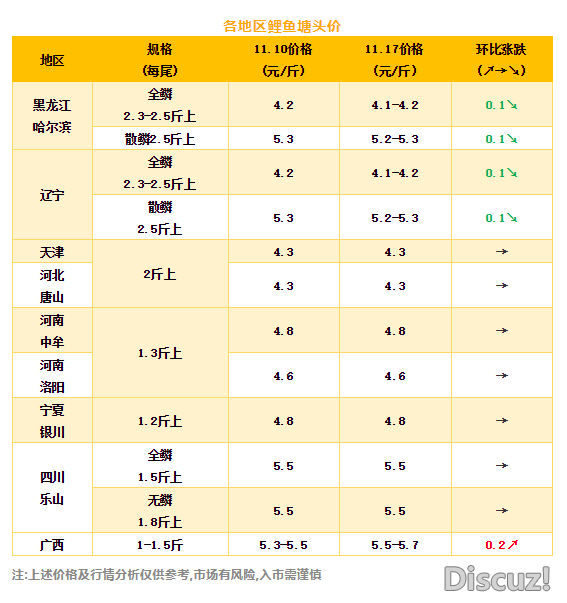 東北地區(qū):黑龍江哈爾濱2.3-2.5斤以上規(guī)格全鱗鯉魚4.1-4.2元/斤,環(huán)比上周下跌0.1元/斤;1.7-1.8斤起步開抓、2.5斤以上規(guī)格的散鱗鏡鯉約5.2-5.3/斤,環(huán)比上周下跌0.1元/斤;遼寧2.3-2.5斤以上規(guī)格的全鱗鯉魚約4.1-4.2元/斤,環(huán)比上周下跌0.1元/斤;2.5斤上規(guī)格的散鱗鏡鯉約5.2-5.3元/斤,環(huán)比上周下跌0.1元/斤。