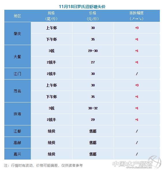 華南地區價格普遍上漲,其中肇慶的價格增長較為明顯,其存塘量也較多;而珠海地區存量較少,價格較為穩定。雖然本周羅氏沼蝦價格繼續上漲,但市場上的實際交易量非常少。而且部分蝦中也已經停止收蝦,選擇外出游玩。