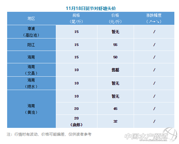 自兩周前福建地區斑節對蝦售罄,蝦中開始到各地抓蝦,也帶動了各地區價格上漲。本周海南地區存量減少,交易量也在同步減少。蝦中表示,當地部分養殖戶出蝦是為了疏密度養大蝦,所以大規格斑節對蝦供應較為不穩定。海南業者表示,今年本地因為“耗底”情況嚴重,養殖戶產量可能減產,再加上現在正常蝦也到了一定規格,養殖戶更傾向存塘春節后賣蝦。預計到12月底,存塘大蝦將會陸續開始出售。
