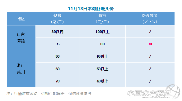各地日本對蝦開始走市場,山東地區35條規格達88元,上漲8元/斤;吳川地區大規格蝦價格未定,市場上非常少人售賣,但60條,70條規格有少量交易。但更多的養殖戶仍然選擇繼續養大,待后市價格更高時出蝦。