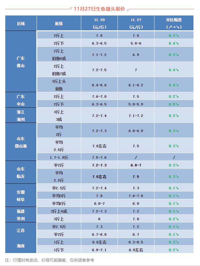 廣東佛山,本周價(jià)格下滑0.4元/斤。近段時(shí)間新魚(yú)掉價(jià)特別嚴(yán)重,本周下滑3-4毛/斤。目前老魚(yú)統(tǒng)貨7.2-7.3元/斤,魚(yú)頭三斤多新魚(yú)價(jià)格為6.1-6.2元/斤之間,大概在四成魚(yú)左右,部分區(qū)域開(kāi)價(jià)更加,據(jù)說(shuō)新魚(yú)只發(fā)到5.8-5.9元/斤之間。本次跌價(jià)這么突然據(jù)介紹主要由于各地本地魚(yú)大量出魚(yú)導(dǎo)致廣東魚(yú)北上銷(xiāo)路不順暢,導(dǎo)致近期新舊魚(yú)降價(jià)明顯。也有業(yè)內(nèi)人士表示,進(jìn)入十二月份魚(yú)價(jià)有可能回暖,目前需要安心等待,切勿恐慌出魚(yú)。