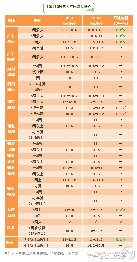 廣東本周魚價略跌0.2-0.3元/斤左右。據了解廣東近期抓魚要求加大,市場的大魚需求多,在出魚方面不斷提高用篩,據魚中反饋目前一些外省車都是拉7寸篩以上的。據說目前計劃出魚的養殖戶不少,隨著水溫逐漸下降,廣東基本上也快要接近停食狀態,擔心掉膘問題,也有些人想清塘開加州水花。3兩多頭的價格在9.8-10.2元/斤之間不等,環比下滑0.2元/斤左右,4兩多頭塘頭發價為10.5-11元/斤之間,不同區域價格上略有差異。
