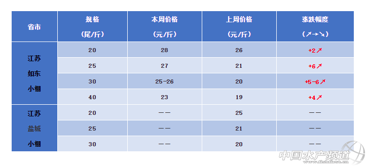 江蘇:如東小棚20條28元/斤,30條25-26元/斤,40條23元/斤。從上周如東蝦價止跌回漲1-3元/斤,這周蝦價繼續發力,養殖戶惜售情緒濃,對比上周同期已經暴漲6元/斤,養殖戶表示這兩天稍落趨穩,前兩天價格更高。目前當地仍有4成小棚蝦待售,預計后期價格穩中有漲。