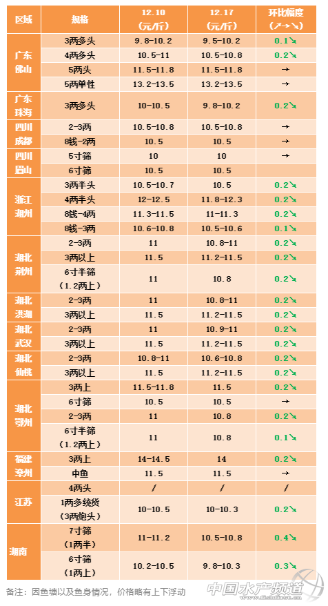 湖北,本周價格下調(diào)0.2-0.3元/斤。目前外來貨依舊比較多,以江浙以及廣東魚為主,近兩天氣溫略有上升,加速各大產(chǎn)地出魚速度以及出魚量,基本上大家也怕掉膘而選擇賣魚,導(dǎo)致本周行情略有下跌。本地的貨普遍在一兩左右的,5-6篩魚居多,大魚偏少,外地每天大約有三萬斤左右的魚進入武漢大市場。當?shù)仞B(yǎng)殖戶對于后續(xù)是否漲價信心不足,認為市面上貨源還有很多,市場消化能力有限,暫時機會不會很大。當前湖北的塘頭價普遍為6寸篩10.5元/斤左右,6寸半篩為10.8-11元/斤,再大規(guī)格的可以達到11.3-11.5元/斤。