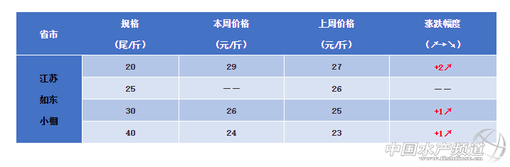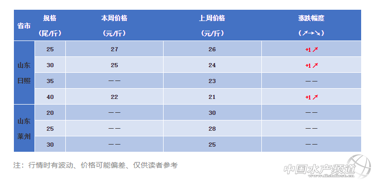 山東:日照25條27元/斤,30條25元/斤,40條22元/斤。山東整體貨源有限,日照地區本周蝦價小幅上漲,海陽、萊州地區基本處于“無市”狀態。