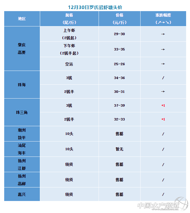 本周珠三角地區(qū)羅氏沼蝦再漲1元/斤,其他地區(qū)價格穩(wěn)定;斑節(jié)對蝦存量漸少,整體價格平穩(wěn);而日本對蝦未見起色,甚至山東日本對蝦慘跌5元/斤。