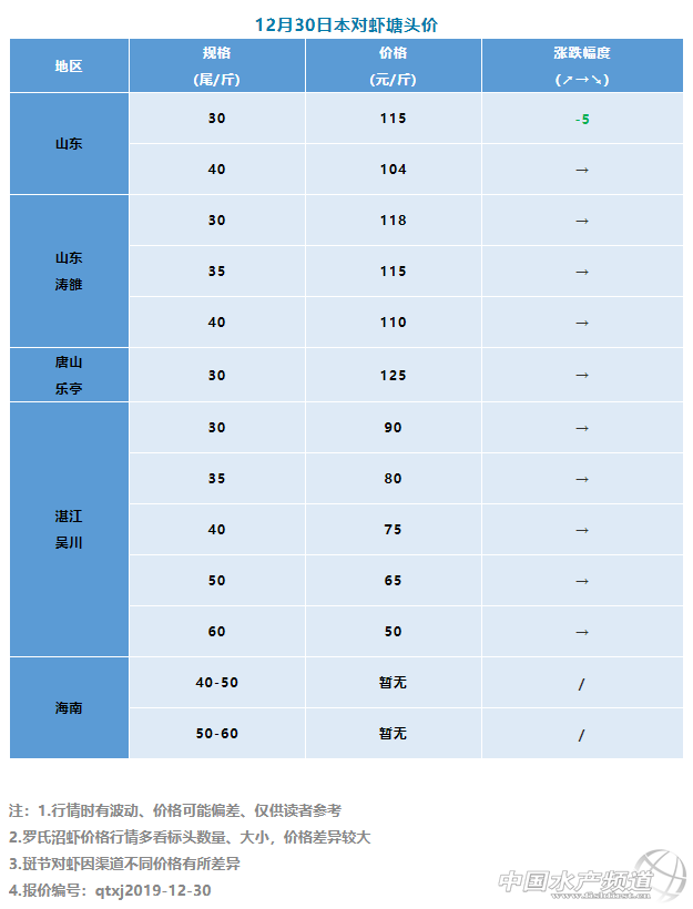 本周日本對蝦的價格仍然停止增長,甚至山東30條規(guī)格日本對蝦下滑5元/斤。業(yè)者表示在在元旦前和春節(jié)前慘遭“滑鐵盧”,價格下跌。而且大部分業(yè)者都坦言,今年的日本對蝦價格沒有達(dá)到預(yù)期,大部分養(yǎng)殖戶盈利低于往年,暫養(yǎng)養(yǎng)殖戶可能面臨虧損或者平賬。