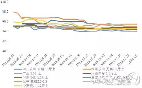 四川地區:冬季期間當地養戶少出魚,魚價基本無變化,春節或有機會漲價;全鱗1.5-2斤以上規格5.5元/斤,同上周;無鱗鯉魚1.8-2斤規格的5.5元/斤,同上周價格。