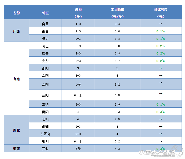 河南:本周河南地區(qū)的草魚行情也是出現(xiàn)了小幅下滑。從養(yǎng)殖戶了解到,目前鄭州、開封等地區(qū)3斤的草魚最新塘頭價只賣到4.3元/斤,較上周下滑0.3元/斤。