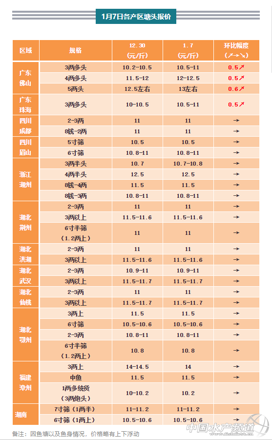 要聞1:廣東黃顙魚強勢上漲超0.5元/斤,大魚缺貨漲幅喜人,目前市場爽市,魚中定魚欲望強烈,出魚速度快。其余產區如湖北、四川、浙江、江蘇、湖南、福建本周行情比較穩定。