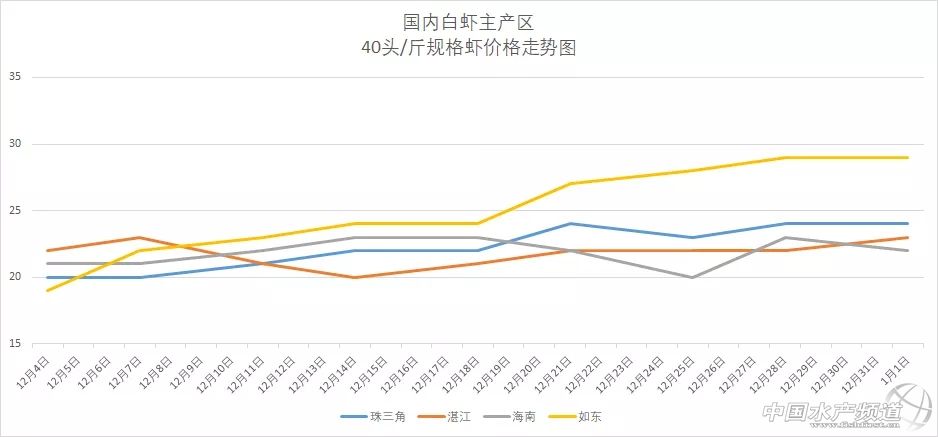 湛江:30條28元/斤,40條23元/斤。湛江地區目前以雷州蝦上市較多,在12月整體來說蝦價都保持穩漲狀態,節后也沒有回落。目前交易量較少,但是存塘量相對較多,養殖戶惜售心理較重,因春節前后當地白蝦需求都較高,預計后期漲價空間較大。