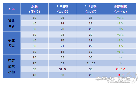 江蘇:如東小棚20條33元/斤,30條31.5元/斤,40條30元/斤。本周如東地區蝦價維持穩中有漲,部分養殖戶已經開始投新苗,也有持有大蝦的養殖戶等待價格上漲再賣。