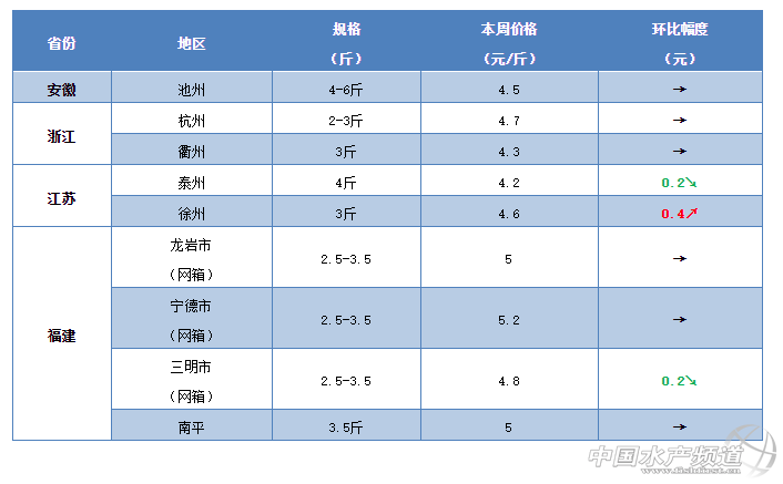從養(yǎng)殖戶(hù)了解到,目前湖北隨州地區(qū)3斤的草魚(yú)塘頭價(jià)賣(mài)4.3元/斤,下滑0.2元/斤;洪湖地區(qū)4斤以上的草魚(yú)塘頭賣(mài)4.5元/斤,3斤以上的賣(mài)4.2元/斤,2斤以上的賣(mài)4元/斤;仙桃地區(qū)3斤的草魚(yú)塘頭只賣(mài)到3.7元/斤。目前,江蘇泰州地區(qū)3-4斤的草魚(yú)塘頭賣(mài)4.2元/斤,下滑0.2元/斤。福建三明地區(qū)3斤左右的草魚(yú)最新塘頭價(jià)賣(mài)4.8元/斤,下滑0.2元/斤。浙江衢州地區(qū)3斤左右的干塘草魚(yú)賣(mài)4元/斤,吊網(wǎng)草魚(yú)賣(mài)4.3元/斤。遼寧沈陽(yáng)2-3斤的草魚(yú)塘頭賣(mài)4.2元/斤,下滑0.2元/斤,3.3斤的塘頭賣(mài)4.3元/斤,3.5斤的賣(mài)4.4元/斤,7斤的草魚(yú)也只賣(mài)到5元/斤。吉林長(zhǎng)春地區(qū)3斤的草魚(yú)最新報(bào)價(jià)4.2-4.3元/斤,下滑0.3-0.4元/斤。有養(yǎng)殖戶(hù)反映,最近河北唐山地區(qū)鯉魚(yú)最新塘頭價(jià)可以賣(mài)到4.2元/斤,上漲0.3元/斤,但3斤的草魚(yú)塘頭價(jià)基本不超過(guò)4元/斤。