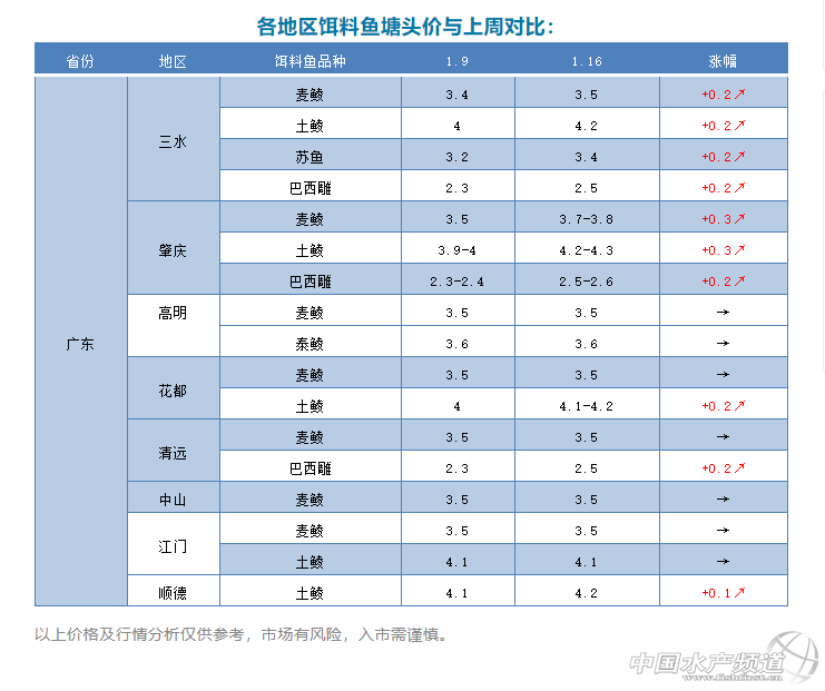 餌料魚:春節將至,拉魚人工和物流成本增加,本周餌料魚價格穩中有升,最高漲0.3元/斤。(