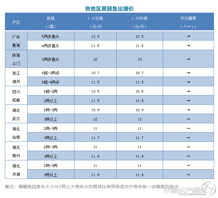 2、本周浙江湖州黃顙魚價格保持穩定,上周起銷量大幅增漲,由于存塘量比較多,價格暫時漲不上去,預計年后銷量會緩慢下滑。