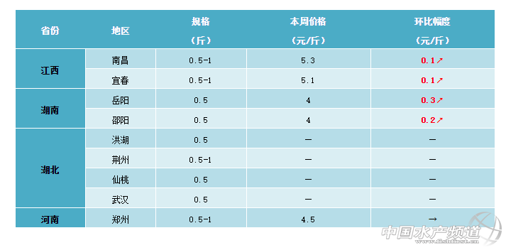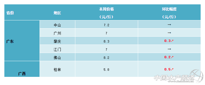 本周華東地區的鯽魚行情整體上有呈現上漲趨勢,局部地區出現大幅上漲。從養殖戶了解到,目前浙江衢州地區9兩以上的鯽魚最新塘頭價賣7元/斤,漲幅超過1元/斤。福建地區鯽魚行情整體還是保持穩定,有養殖戶表示昨天開始閩江部分碼頭已經停止賣魚了,局部地區開始有上漲趨勢。目前,南平地區鯽魚最新塘頭價還是維持在5元/斤,暫時沒有出現明顯波動;三明地區鯽魚零售價大漲,市場最新報價可以賣到12元/斤。