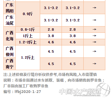 粵東地區:惠州1.2-1.8斤規格市場非上午車4.1元/斤,下午車4.2元/斤,同上周價格;因福建凍廠放假,揭陽和汕尾9兩以上規格廠非保持3.1-3.2元/斤的價格;汕尾海豐1斤以上規格市場非塘頭價4元/斤,揭陽同規格3.6元/斤,皆保持上周行情。
