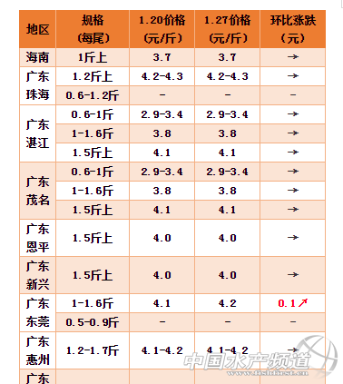 春節期間,工廠及大部分業者休假,各產區羅非魚價格基本與上周持平:海南繼續保持上周行情;珠三角地區,珠海、恩平、新興魚價與上周持平,東莞1.2-2斤以上規格市場非較上周上調0.1元/斤;粵東地區惠州、揭陽和海豐魚價保持不變;粵西地區湛江和茂名廠非和市場非與上周行情持平;廣西地區北海、南寧和柳州羅非行情與上周一致。