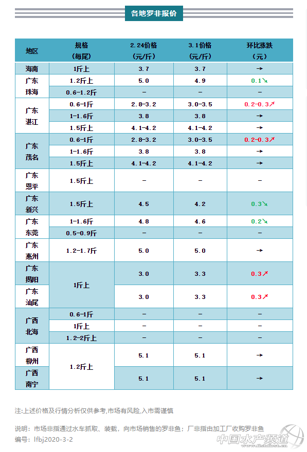 本周部分產區廠非價格回升,但一些地區市場非價格下調;海南地區廠非行情保持,市場非較上周下調0.1-0.2元/斤;珠三角地區,珠海1.2斤以上規格市場非較上周下調0.1元/斤;恩平本周魚價數據暫缺;新興1.5斤以上規格市場非較上周下調0.3元/斤;東莞1-1.6斤市場非較上周下調0.2元/斤;粵東地區惠州1.2-1.8斤規格市場非價格保持;揭陽和海豐1斤以上廠非較上周上調0.3元/斤,兩地1.3斤以上規格市場非價格與上周持平;粵西地區湛江和茂名廠非0.6-1斤規格較上周上調0.2-0.3元/斤,1斤以上規格廠非價格保持不變,1.5斤以上規格市場非同上周行情;廣西地區北海羅非行情暫缺,南寧與柳州1.2斤以上規格市場非行情和上周一致。