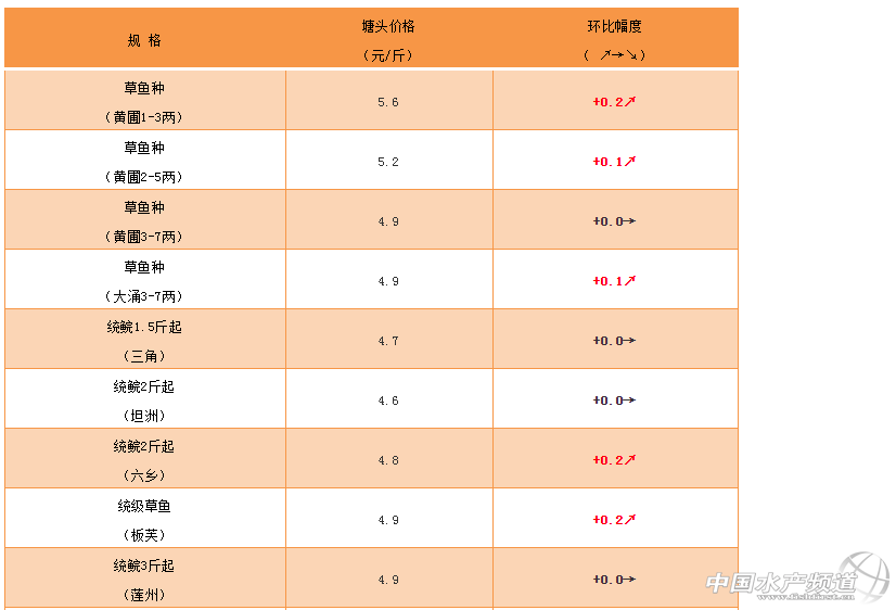 中國水產頻道原創報道,草魚種:本周價格仍然穩中有升,漲幅在0.1-0.2元/斤。周邊養殖地區對中山草魚種需求數量增多,養殖戶等著放新苗,后續預測價格還會有所增漲。近期天氣反復,魚塘病害較多,建議定期消毒改底并做好病害防治工作。