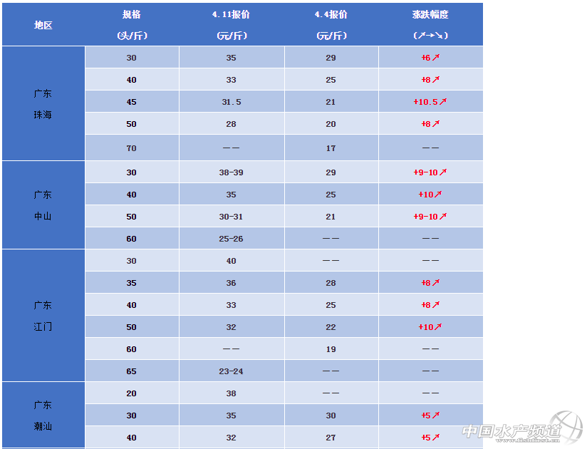 對比上周同期,珠三角地區漲幅基本在8元以上/斤,最高暴漲11元/斤!40-50條蝦暢銷,價格節節攀升,珠三角成品蝦存塘量已經接近于零,白蝦供不應求,不少蝦車已經暫停抓蝦,少量養殖戶還在持蝦待價。去年4月中旬時珠三角蝦價的高峰期,40頭最高成交價達到42元/斤,按照現在的蝦價上漲勢頭,在五一假期前后,蝦價能否趕超去年?不少人表示期待這一天的到來。