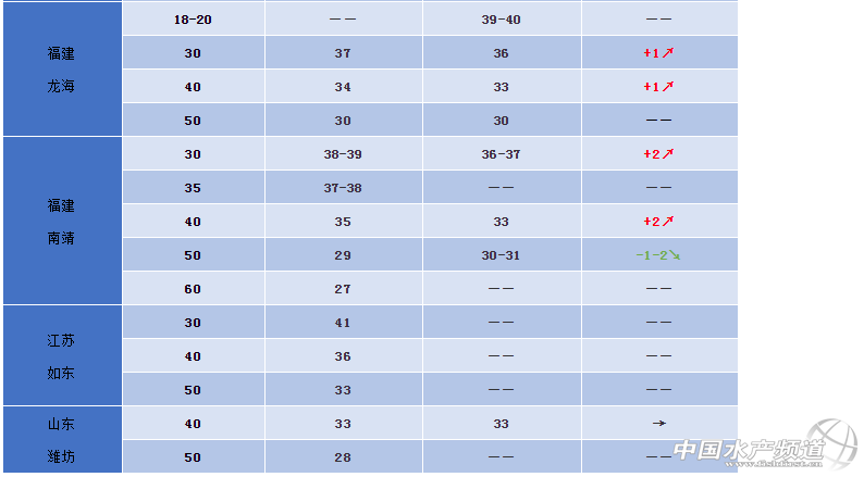 本周漲價最猛的還屬湛江地區,據統計,湛江一周內漲價幅度超10元以上/斤。雖然珠三角地區近一周蝦價下滑帶來一些負面消息,但是仍有湛江養殖戶堅持待價出蝦,他表示:“現在蝦不多了,湛江蝦價很少像珠三角一樣大起大落,盡管讓高價再飛一會!”而福建地區近期受江蘇如東鍋爐蝦上市影響,蝦價上漲乏力,大蝦價格穩定,但是中小規格蝦回落較快,尤其是近幾天天氣變化,病蝦上市也影響了價格。