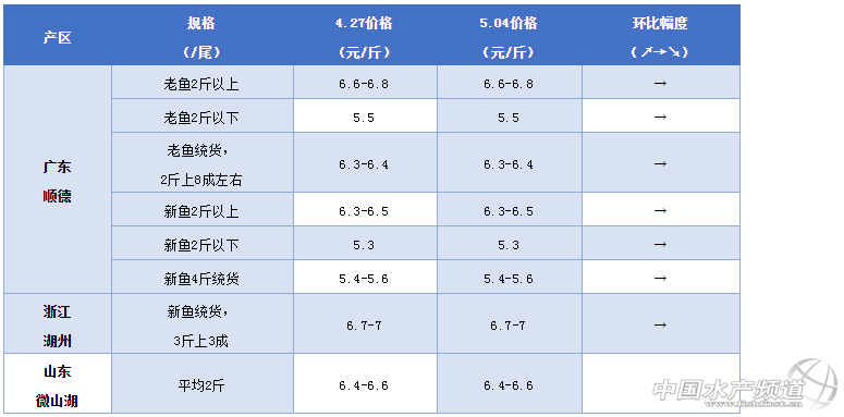 2、浙江湖州本周價格保持穩(wěn)定,新魚統(tǒng)貨3斤上3成左右報價6.7-7元/斤。山東微山湖產(chǎn)區(qū)本周價格也保持穩(wěn)定,平均2斤報價6.4-6.6元/斤,節(jié)后銷量減少了。