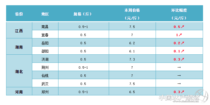 本周華中地區的鯽魚行情持續走高。雖然,節后部分品種的市場行情有不同的程度的下滑,目前白鰱賣到2.3-2.4元/斤,下滑了0.4元/斤左右,草魚也稍微有小幅下滑,但由于目前鯽魚、鳊魚等普遍缺貨,最新價格仍然穩中有升。據了解,目前武漢白沙洲市場半斤的鯽魚賣到9.5元/斤,8兩的鯽魚批發價可以賣到10.5元/斤。目前洪湖地區半斤的鯽魚最新塘頭價賣7-7.5元/斤,最高上漲0.5元/斤;仙桃地區半斤的鯽魚批發價在7元/斤,基本維持穩定;隨州地區半斤的鯽魚塘頭價賣5.8元/斤,較上周有0.7元/斤的回落。