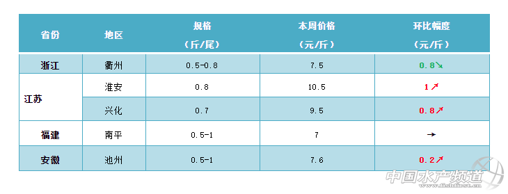 本周華東地區的鯽魚行情繼續保持強勢上漲。據了解,目前江蘇淮安地區半斤的鯽魚塘頭賣8元/斤,一個月漲了3塊多。江蘇泰州地區半斤的鯽魚塘頭賣8元/斤,8兩的賣到12元/斤;鹽城地區1兩的鯽魚苗賣到8元/斤,9兩以上的賣11.5元/斤,1斤以上的鯽魚塘頭價賣到12.6元/斤,再創歷史新高。據養殖戶介紹,目前福建南平地區半斤以上的鯽魚塘頭賣7元/斤,基本維持穩定。節后浙江地區的鯽魚行情有所回落,目前衢州地區半斤的鯽魚塘頭價在7.5元/斤左右,相比上周有0.8元/斤左右的回落。