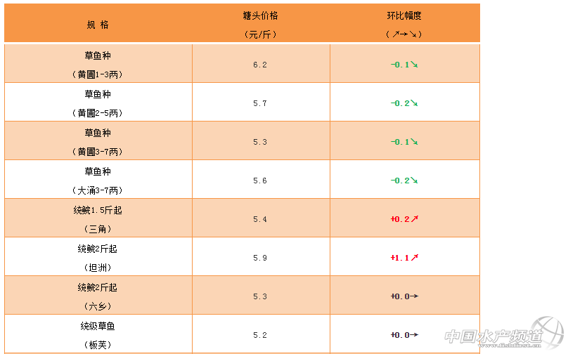 脆肉鯇:本周脆肉鯇價格下跌較快。現階段溫度升高,脆肉鯇需求減少,日抓魚量減少近半數,行情短期內預計會較為低迷。