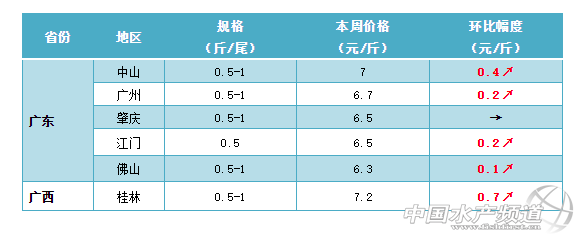 本周華南地區的鯽魚行情出現明顯上漲勢頭,一周內最大漲幅達到0.7元/斤。從流通商了解到,目前中山地區半斤的鯽魚最新塘頭價已經賣到7元/斤,較上周上漲0.5元/斤。本周廣西多地鯽魚塘頭價也是出現明顯上漲,其中武宣地區半斤的鯽魚最新塘頭價賣到7元/斤,較上周上漲0.5元/斤;目前桂林地區半斤的鯽魚塘頭價已經賣到7.2元/斤,較上周上漲0.7元/斤。