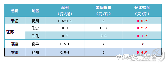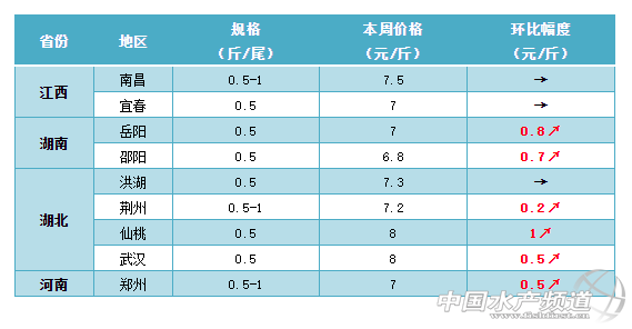 本周華東地區的鯽魚行情繼續保持上漲勢頭,江蘇部分地區再次出現大幅上漲。據養殖戶介紹,目前江蘇泰州地區半斤的就塘頭賣8.8元/斤以上,較上周上漲0.8元/斤。目前,浙江衢州地區半斤以上的鯽魚塘頭價賣到8元/斤,較上周上漲0.5元/斤;福建南平地區半斤的鯽魚塘頭價還是繼續維持在7元/斤,暫時沒有明顯變化;安徽池州地區半斤以上的鯽魚塘頭價也已經可以賣到8元/斤。
