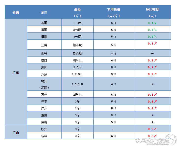目前,3斤左右的草魚在廣東中山地區塘頭已賣到5.6元/斤,上漲0.1元/斤;廣西桂林地區最新報價6.3元/斤,上漲0.3元/斤;湖南永州地區塘頭賣6.5元/斤,最高上漲0.7元/斤;河南開封地區最新塘頭價賣5.7元/斤,上漲0.2元/斤;四川德陽、廣元、綿陽等地區最新塘頭價賣到6.4元/斤左右,繼續有0.2元/斤的左右的上漲;湖南常德地區最新塘頭價賣5.5元/斤。