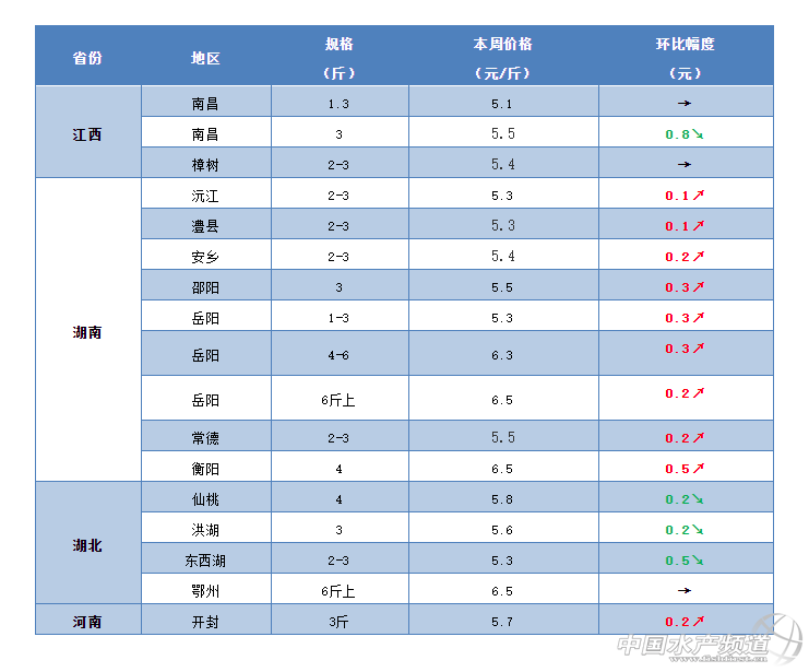 湖北:本周湖北地區的草魚行情也是穩中有降。據最新了解,這幾天湖北洪湖地區的草魚行情出現下滑,3斤左右的草魚塘頭賣5.6元/斤左右,較之前最高下滑0.4元/斤;仙桃地區3斤的草魚最新塘頭價賣5.1元/斤,相比之前有0.2元/斤的小幅下滑;隨州地區的草魚行情繼續保持穩定,3斤的從草魚最新塘頭價賣6元/斤,基本維持上周水平。