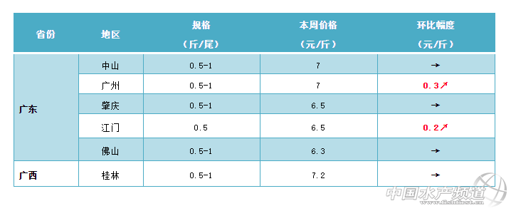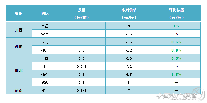 本周華南地區的鯽魚行情繼續保持上漲勢頭,目前珠三角地區半斤以上的鯽魚塘頭價基本已突破7元/斤,1斤以上的塘頭最高可以賣到13元/斤。