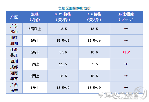 5、湖南華容本周價格保持穩定,8兩上報價是18.5元/斤,市場需求量大,價格后期有一定的上漲空間。廣西南寧本周價格也保持穩定,報價18.5-19元/斤,當地大規格魚比較少,市場比較缺魚,銷量跟上周差不多。