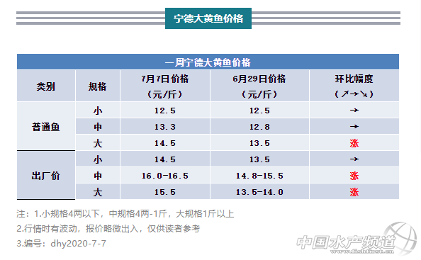 本周寧德大黃魚大規(guī)格(8兩以上)行情維持上漲,海面收購(gòu)價(jià)漲幅1元/斤,這已經(jīng)是大黃魚連續(xù)兩周出現(xiàn)上漲。而加工廠收購(gòu)價(jià)受收魚成本上升,也略微上調(diào)報(bào)價(jià)。