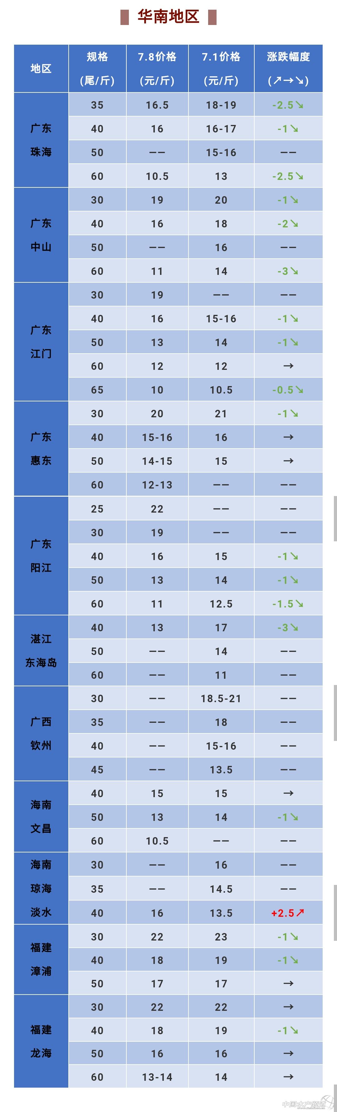 福建地區(qū)對比上周同期下滑1元/斤,目前病蝦有所減少,上市規(guī)格主要在50頭上下。