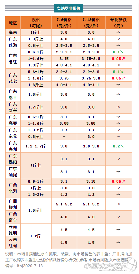海南地區:現時存塘的大多是0.6-0.7斤規格,工廠每天仍可收購200萬斤左右,0.6-1斤規格2.8元/斤,1斤以上規格3.8元/斤,皆同上周價格,而1斤上塘頭現金收購價3.4-3.6元/斤,環比上周下調0.1元/斤,同規格走西線市場羅非塘頭價3.5元/斤,保持上周價格。