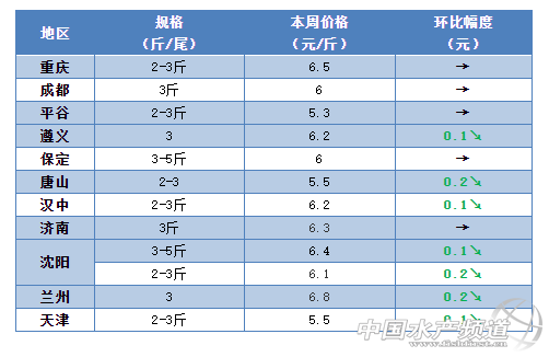 西北地區:本周西南地區的草魚最新報價較上周繼續有小幅下滑。據流通商介紹,目前甘肅蘭州市場3斤的草魚最新報價6.8元/斤,較上周下了滑0.2元/斤。