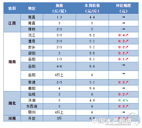 河南:本周河南地區的草魚塘頭價也是終于漲了。從養殖戶了解到,目前鄭州地區3斤的草魚最新塘頭價賣到6.5元/斤,相比上周上漲0.4元/斤。