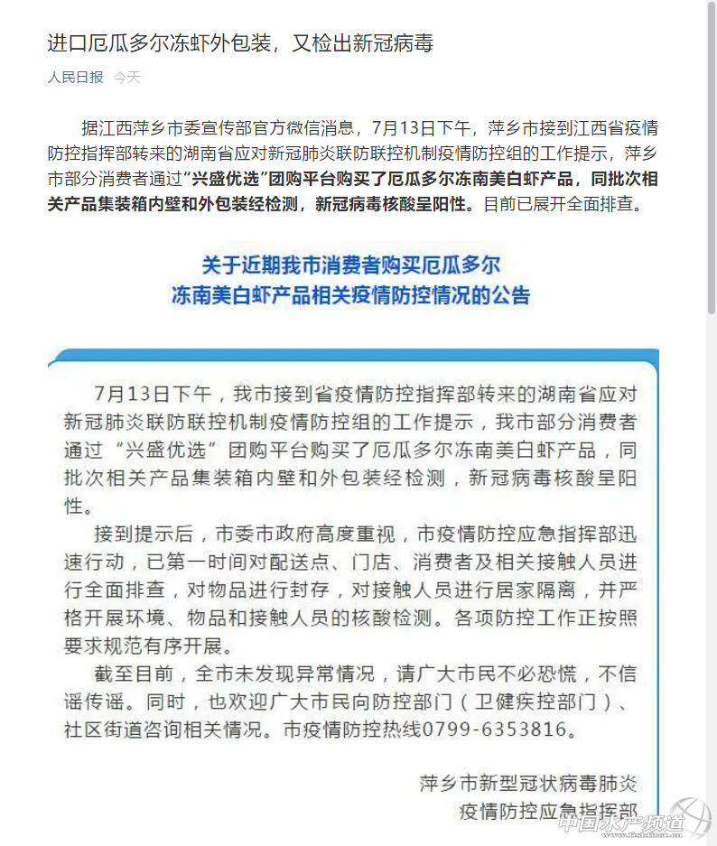 今天(7月15日),厄瓜多爾凍蝦又一次站上了風口浪尖!據江西萍鄉市委宣傳部官方微信消息,7月13日下午,萍鄉市接到江西省疫情防控指揮部轉來的湖南省應對新冠肺炎聯防聯控機制疫情防控組的工作提示,萍鄉市部分消費者通過“興盛優選”團購平臺購買了厄瓜多爾凍南美白蝦產品,同批次相關產品集裝箱內壁和外包裝經檢測,新冠病毒核酸呈陽性。目前已展開全面排查。