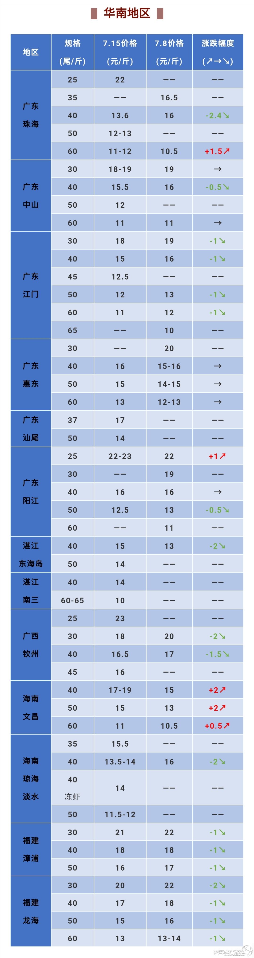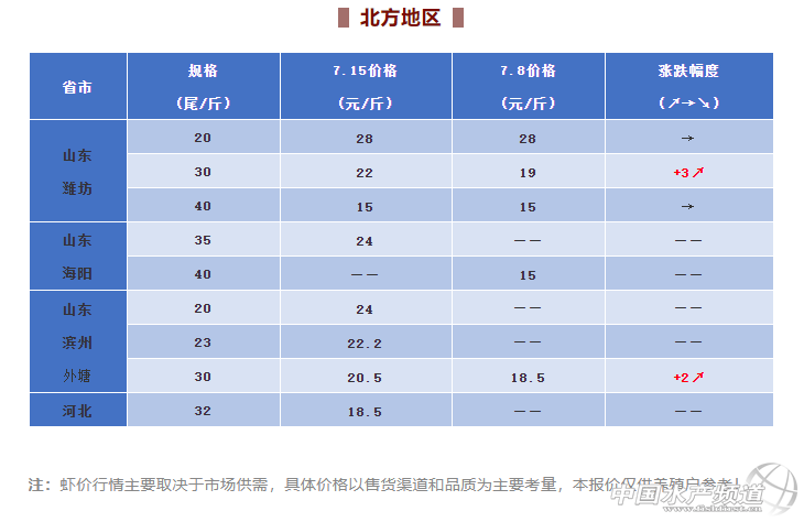 對比上周三,本周蝦價有漲幅較大的是山東部分產區蝦價,如因北京市場需求上漲而上漲的海陽地區,當地養殖戶表示35頭已經賣到24元/斤,“現在我們這邊的大蝦都不夠賣!”他說道。濰坊的30頭蝦對比上周上漲明顯,推測是大規格蝦在北方市場較為吃香,因此價格在短期內上漲較快。另外,海南地區也有養殖戶表示近期小販抓蝦報價較高,優質的40頭蝦能去到19元/斤,但是量不會很多。另外,也有養殖戶表示天氣炎熱,現在活蝦不好走市場,更多是加工廠收購,40頭淡水蝦進廠價為14元/斤。其實,對比上兩周活蝦40頭才14-15元/斤,現在海南的價格算是回暖。也有瓊海養殖戶表示近段時間蝦價變動不大,各種規格都有,市場不算熱鬧。