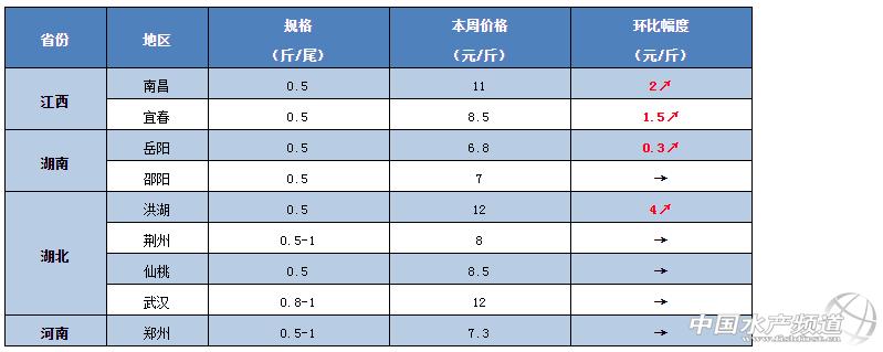 本周東北、華北、西南等地的鯽魚價格行情暫時沒有出現太大波動,目前遼寧沈陽地區(qū)半斤左右的鯽魚最新塘頭賣8.9元/斤;河北唐山地區(qū)半斤以上的鯽魚塘頭賣9元/斤;四川自貢地區(qū)半斤的鯽魚塘頭賣8.5元/斤;德陽地區(qū)大規(guī)格的賣9元/斤以上。有流通商表示,目前四川成都市場6-8兩的鯽魚批發(fā)賣10元/斤,不過銷量不是很大。最近西北地區(qū)的鯽魚行情有所下滑。據流通商介紹,目前甘肅蘭州賣10元/斤,較上周同期下滑1元/斤。