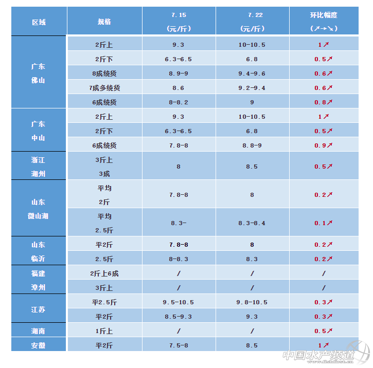 價格方面,相比于上周各地均有不小的漲幅。湖南、湖北兩地為最,高達3元/斤!可能和前段時間洪水肆虐,養殖戶大量出魚導致現在存塘不多有關。其余各地漲幅均在0.5-1.5元/斤之間。