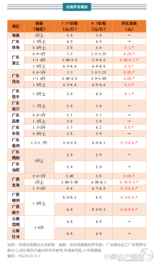 廣西地區:放養密度相對較低加上高溫期控料投喂,死魚不算特別嚴重,不過頂不住的養戶已經出魚,現在存塘規格魚不多,工廠、魚中都在四處尋找,甚至到廣東搶魚,行情逐漸上調。有業者表示按目前形勢,原來無養殖計劃、丟空魚塘的養戶很可能在8、9月投苗。北海0.6-1斤規格廠非3元/斤,小非每多1成增加0.05元,最高3.5元/斤,環比上周上調0.05元/斤,而1斤上規格廠非4.05元/斤,環比上周上調0.2元/斤,1萬斤起4.1元/斤;市場非1-2斤4.5元/斤,1.2-2.2斤地網4.7-4.8元/斤,環比上周上調0.2元/斤。南寧1.5斤上規格羅非5.2-5.3元/斤,環比上周上調0.4-0.5元/斤。柳州1.5-2斤規格羅非5.5元/斤,環比上周上調0.3-0.5元/斤。欽州、防城港同規格4.9-5元/斤。