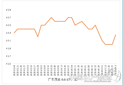 粵西地區:現時規格魚比較少,魚中四處尋覓,但基本每個塘都抓不夠,價格繼續上調。正值臺風天雨水多,稍微緩和前段時間高溫天氣帶來的影響,以眼下行情走勢,養戶出魚不太積極,或希望繼續養大賣市場。湛江、茂名兩地1.5斤以上規格市場非4.3-4.4元/斤,地網魚4.5-4.6元/斤,環比上周上調0.2元/斤。加工廠方面6兩非價格平穩,1斤上存量少工廠搶魚,若成數高便加價,行情稍稍上調。0.6-1斤規格廠非3元/斤,成數高的3.25元/斤(2.95起加3成3.05,4成3.15,5成3.25),環比上周上調0.25元/斤;1斤上規格,湛江3.9-4元/斤,環比上周上調0.05-0.1元/斤,茂名3.9-3.95元/斤,上調0.05元/斤,超1.6斤規格魚基本不再扣錢或拒收,而藥殘僅扣錢不拒收(有些廠不扣)。