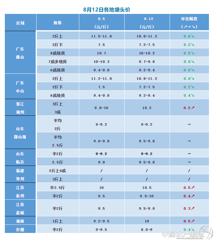 安徽本周下跌0.4元/斤。新魚或將上市,對魚價有一定的影響,目前平2斤最高發(fā)9元/斤,平2.5斤的為9.4元/斤。