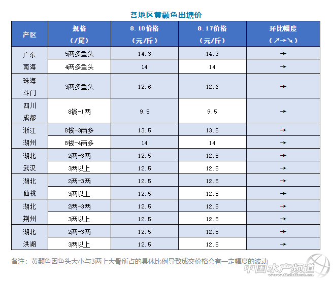2、浙江湖州黃顙魚價格保持穩定,3兩多魚頭13.5元/斤;4兩多魚頭報價14元/斤。湖北各地黃顙魚價格,2-3兩多魚頭價格在12.5元/斤左右,價格持穩,銷量跟上周也差不多。預測接下來價格還會