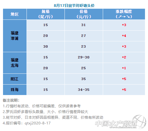 本周各地斑節對蝦價格走勢趨好,其中陽江、珠海地區漲幅最高,達5元/斤,福建地區也有較大程度的上漲。福建流通從業者表示,估計福建價格還會再漲,個人還是非常看好后市價格。廣東從業者則表示,近期各地開漁,可能會影響較長一段時間。